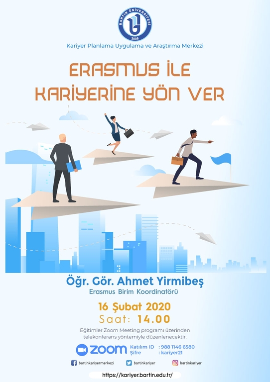 Kariyer Planlama Uygulama ve Araştırma Merkezi etkinlikleri kapsamında Üniversitemiz öğrenci ve mezunlarına yönelik Erasmus öğrenim ve staj hareketliliği, yurtdışı eğitim fırsatları ve kariyer süreci konusunda 16 Şubat 2021 Salı günü saat 14.00'de Zoom Meeting üzerinden online olarak Üniversitemiz Erasmus Koordinatörü Öğr. Gör. Ahmet Yirmibeş'in tarafından 'Erasmus ile Kariyerine Yön Ver' konu başlıklı eğitim düzenlenecektir.