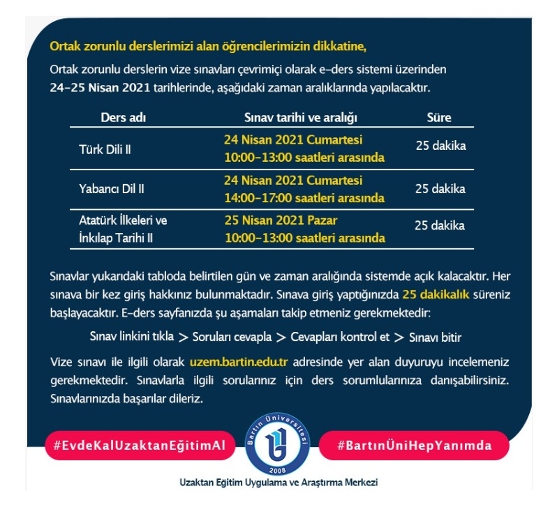 Uzaktan eğitim yoluyla verilen ortak zorunlu derslerin vize sınavları aşağıdaki afişte belirtilen tarih ve saat aralıklarında e-ders sistemi üzerinden çevrimiçi sınav şeklinde gerçekleştirilecektir.