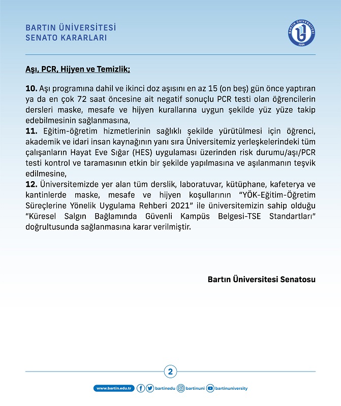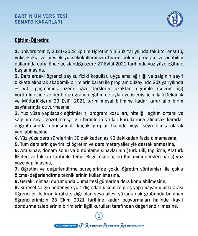Senato Kararları (2021-2022 Güz yarıyılına yönelik)