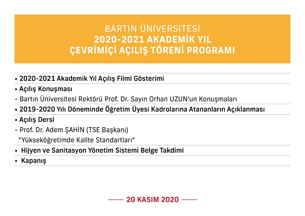 Üniversitemiz 2020-2021 Akademik yılı açılış töreni 20 Kasım 2020 Cuma saat 14:30'da çevirimiçi olarak yapılacaktır. Tüm öğrencilerimiz davetlidir.