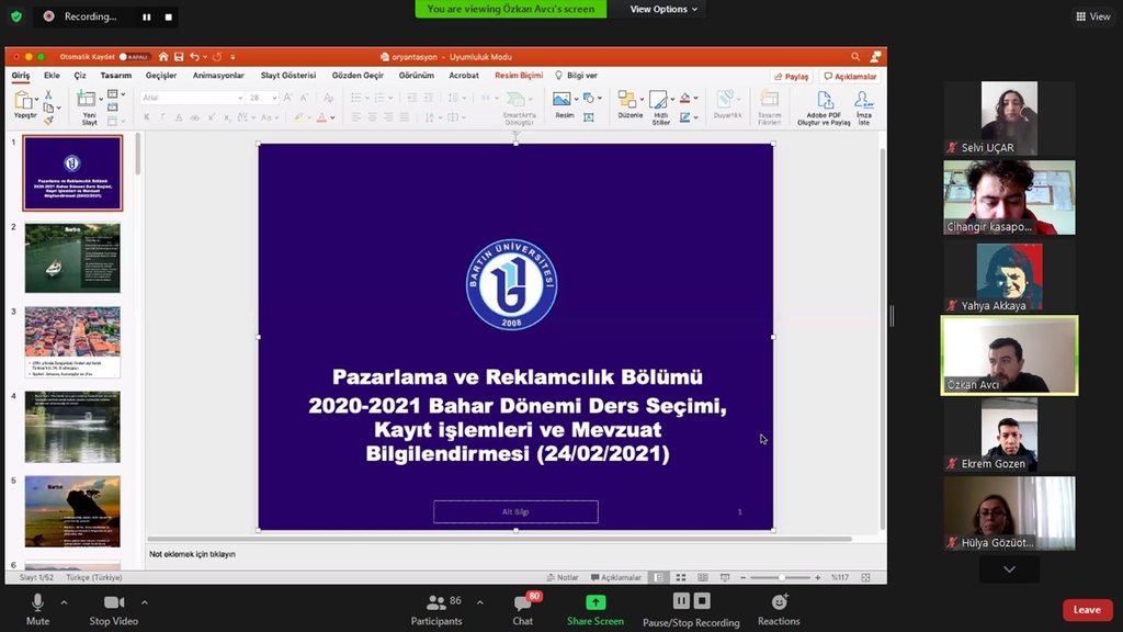 2020-2021 Akademik yılında akademik danışmanlık ve yıllık eylem planı kasamında öğrencilerimize ders seçimi, mevzuat  konusunda bilgilendirme toplantısı yapıldı. Toplantıda öğrencilere ayrıca bölüm dışı seçmeli dersler, ölçme değerlendirme esasları, ÇAP/Yan dal, kredi ve AKTS sistemi ile ders bilgi paketleri konularına da değinildi. Bölümüz 1. ve 2. sınıf öğrencilerinden toplam 86 kişinin katıldığı toplantı soru cevap kısmının ardından sona erdi.