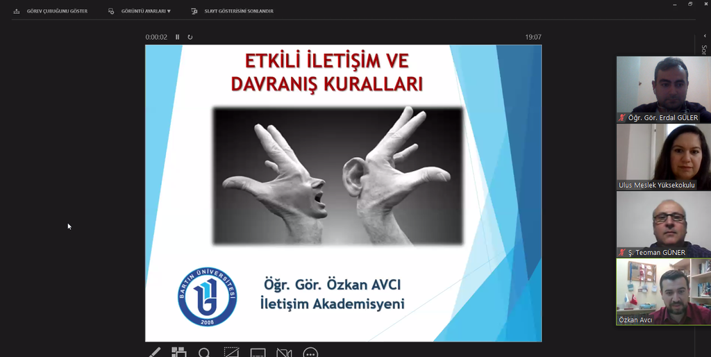 Ulus Meslek Yüksekokulu tarafından  düzenlenen Mesleki Söyleşiler XIII etkinliğinde Pazarlama ve Reklamcılık Bölüm Başkanı Öğr. Gör. Özkan Avcı  “Etkili İletişim ve Davranış Kuralları” konulu bir eğitim verdi.  Çevrimiçi olarak gerçekleştirilen etkinliğin açılış konuşmasını yapan Ulus Meslek Yüksekokul Müdürü, Doç. Dr. Şükrü Teoman Güner: “İnsan sosyal bir varlıktır. Bu nedenle insanın gelişim sürecinde, sağlıklı bir kişiliğin oluşmasında, etkin iletişim ve davranış kuralları önemli bir paya sahiptir. İletişim, örgütsel motivasyonu ve performansı, kurumsal kimliği ve aidiyet duygusunu arttıracağı bilinciyle Öğr. Gör. Özkan Avcı’ya katkılarından dolayı şimdiden çok teşekkkür ederiz” dedi.